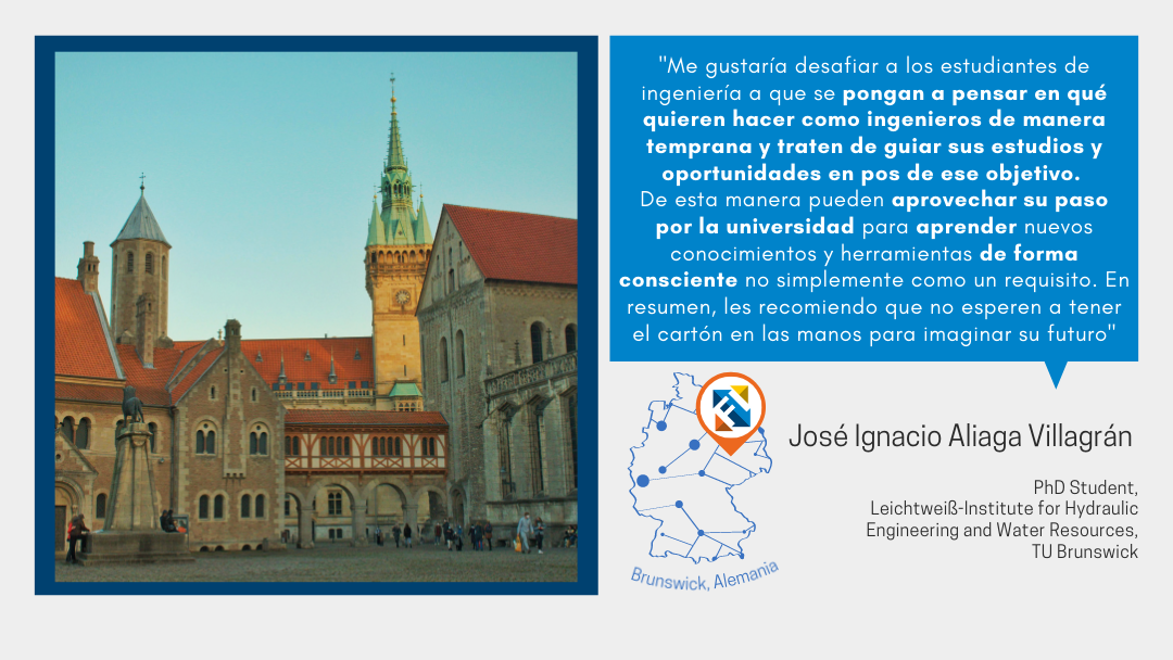 José Ignacio Aliaga Villagrán egresado de Ingeniería Civil de la Universidad de Concepción, desde 2020 vive en Alemania y hoy se encuentra desarrollando investigación para un doctorado sobre Ingeniería hidráulica y recursos hídricos en Leichtweiß-Institute, Technische Universität Braunschweig, Alemania.