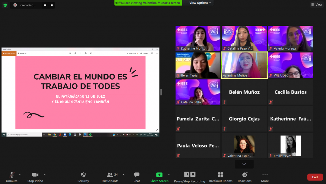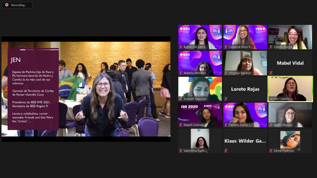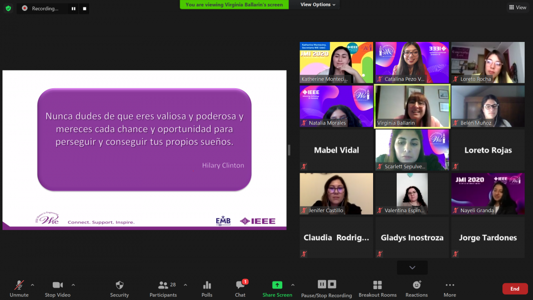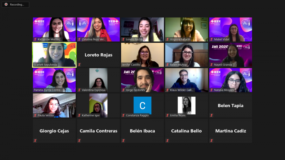 Continuando el encuentro se presentó Virginia Ballarin, ingeniera electrónica y co-Chair del Comitee of Women in MBE , “nos comentó sobre un concepto que es STEMpreneurs, que son las emprendedoras en STEM femeninas. Ahí comentaba sobre la superación, que había que atreverse y eso en realidad fue muy genial, porque nunca habíamos visto este concepto que trataba del atreverse a emprender e innovar en áreas STEM siendo mujer”, destaca Catalina estudiante de ingeniería civil informática de nuestra Facultad de Ingeniería UdeC. Finalmente el primer día finalizó con la charla de Jennifer Castillo, quien durante el 2021 será la Chair de IEEE Women in Engineering, la instancia se marcó con su interacción con Virginia respecto a sus experiencias juntas gracias a las organizaciones en las que participan.