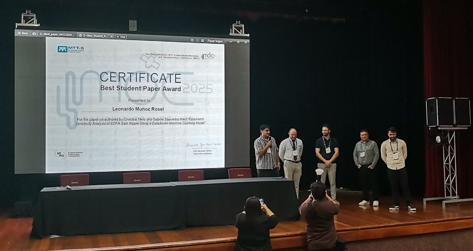El ingeniero civil en Telecomunicaciones, Leonardo Muñoz Rosel, egresado de la Universidad de Concepción (UdeC) y alumno del Magíster en Ciencias de la Ingeniería con Mención en Ingeniería Eléctrica, ganó el premio al mejor paper estudiantil en la conferencia 21st SBMO/IEEE MTT-S International Microwave and Optoelectronics Conference (IMOC) 2025, realizada del 9 al 12 de noviembre en Campina Grande, Brasil.